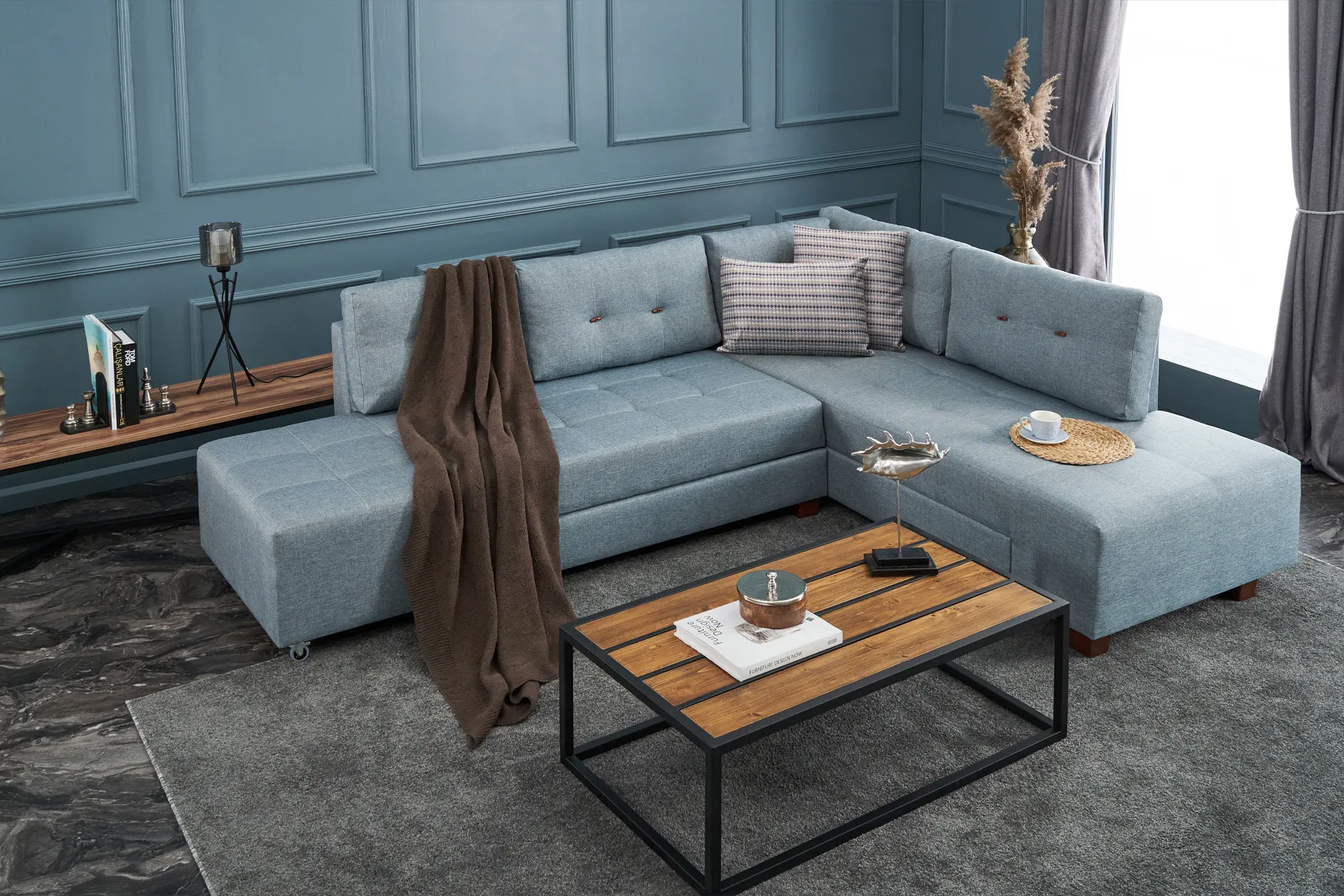 Manama Stil Yataklı Köşe Koltuk Mavi Sağ için konforlu ve şık bir seçenek.